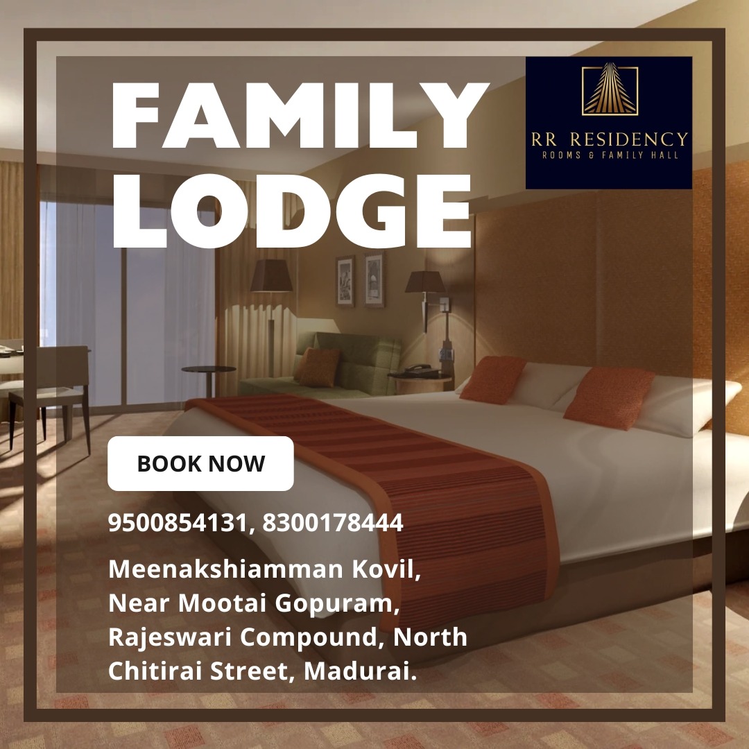 RR Lodge is a comfortable family lodge near Meenakshi Amman Temple, offering clean rooms, affordable rates, and a convenient stay in the heart of Madurai. If you are looking for a hotel near Meenakshi Amman Temple or planning your Madurai hotel booking, our lodge is the perfect choice for families, tourists, and pilgrims. Located close to the temple and city attractions, RR Lodge provides easy access to the railway station, bus stand, and shopping areas. For travelers searching for a lodge nearby with reliable service and homely comfort, RR Lodge Madurai is an ideal stay option.